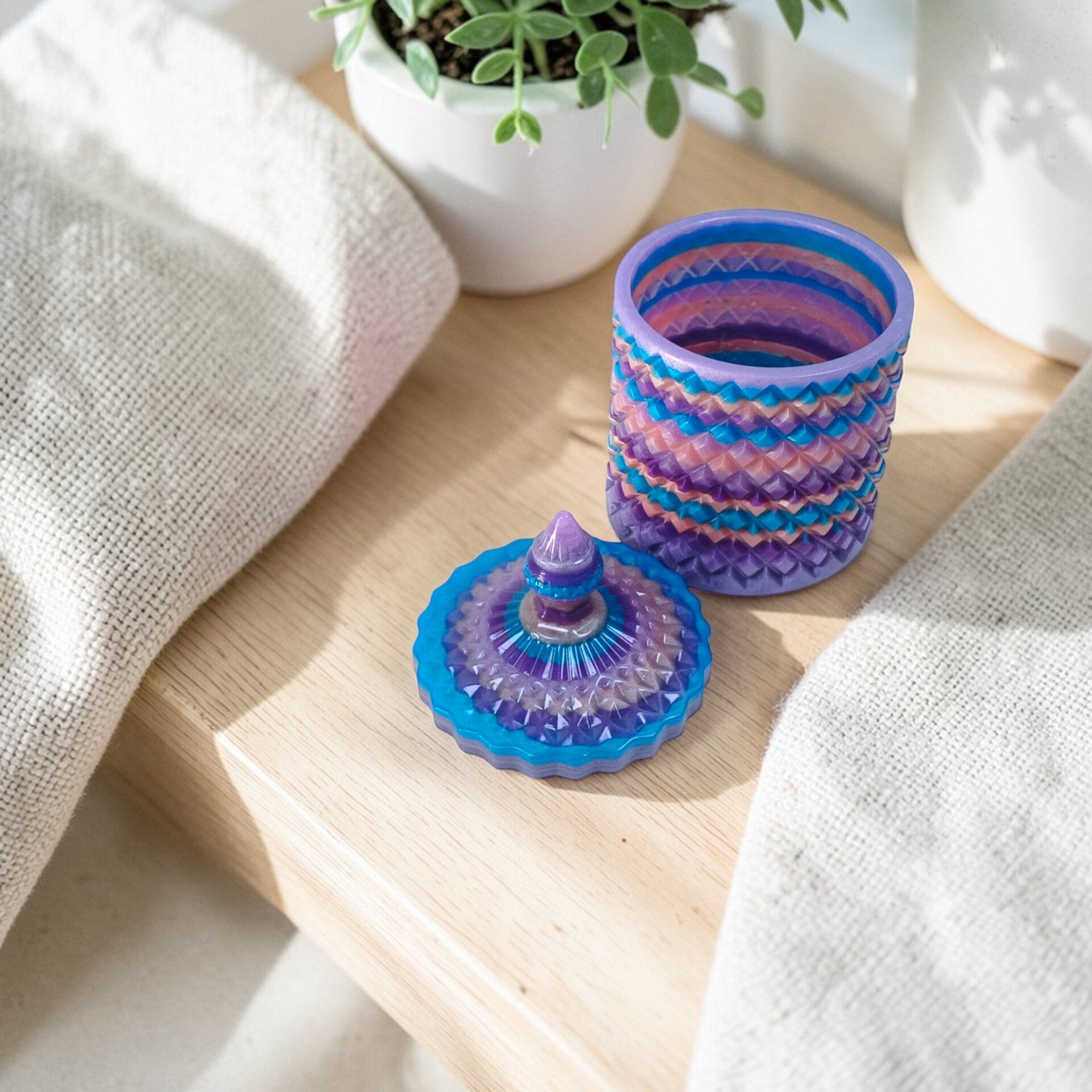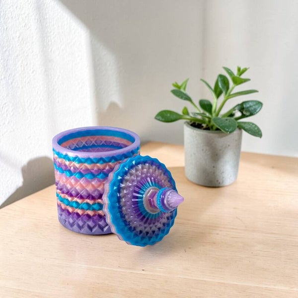 Chaque image révèle une facette du grand pot rayure féerique : les variations de couleur, les reflets subtils de la résine et cette présence lumineuse qui attire naturellement le regard.