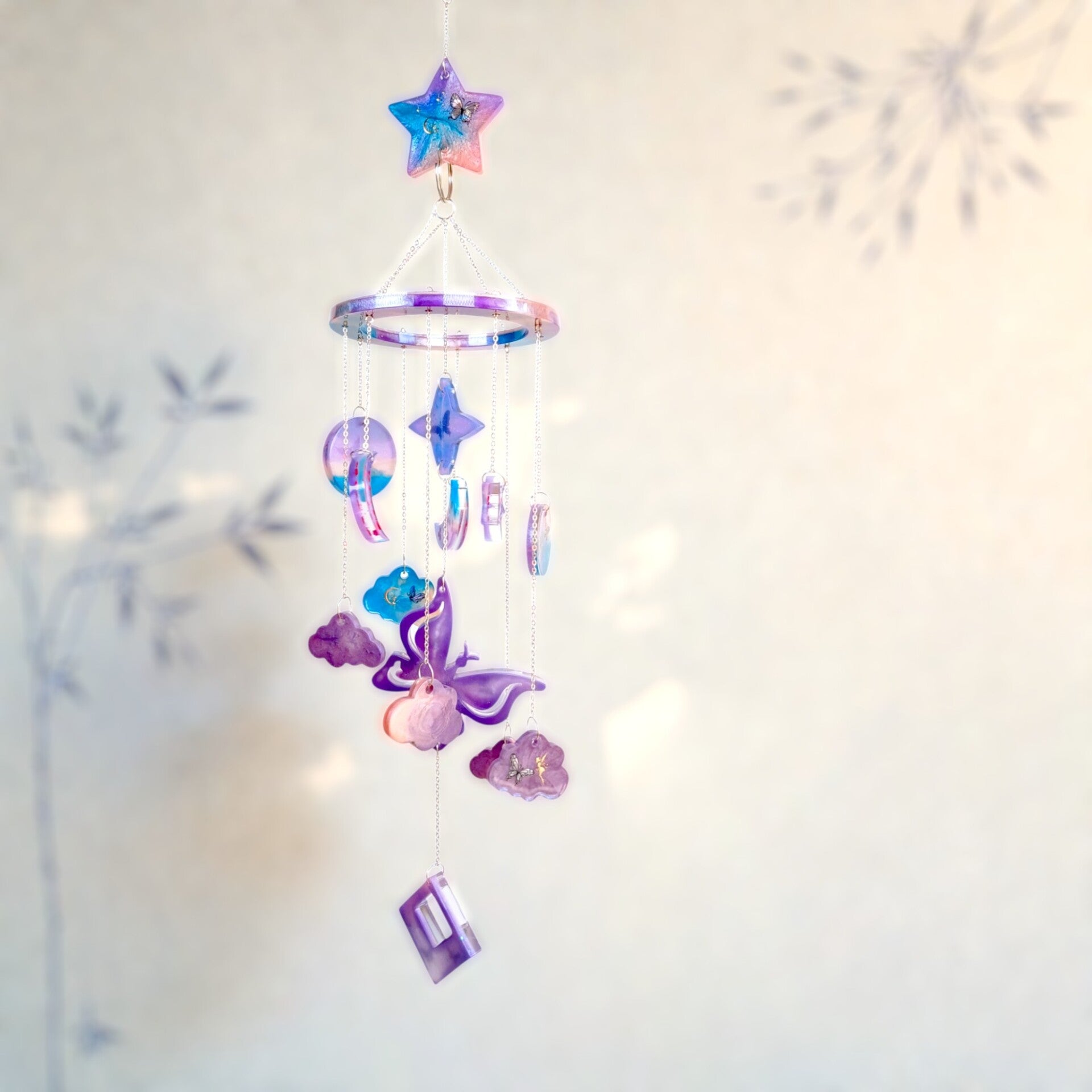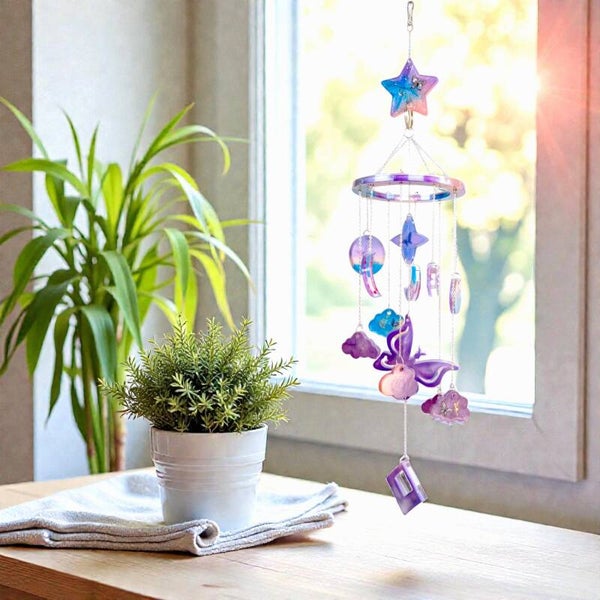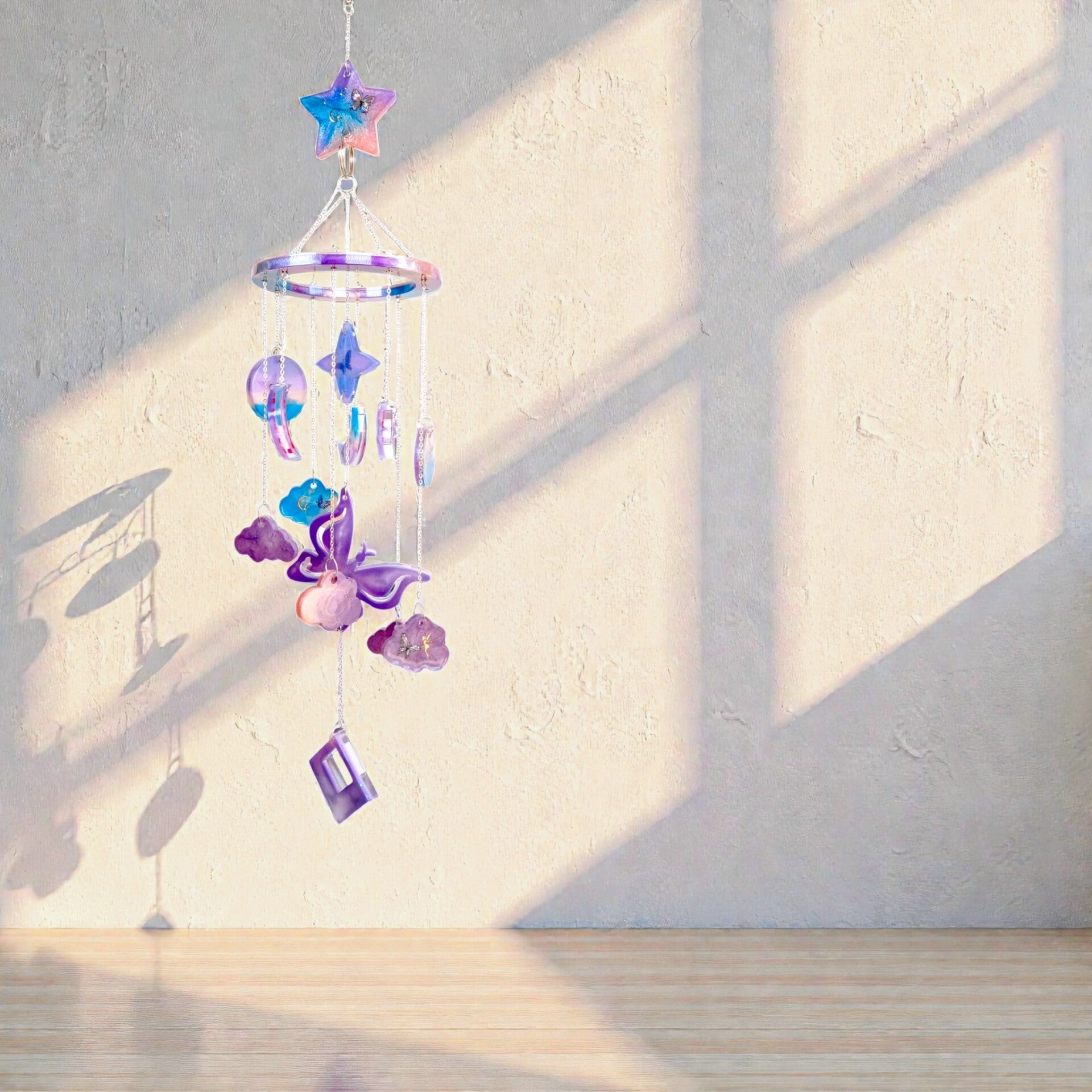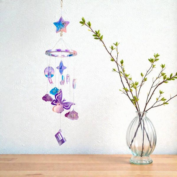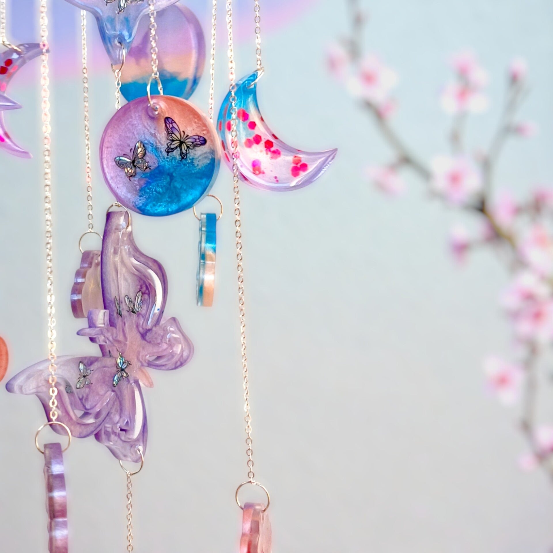 Ses éléments suspendus, leurs nuances pastel et les reflets délicats de la résine offrent une présence visuelle apaisante, idéale pour une ambiance douce et harmonieuse.