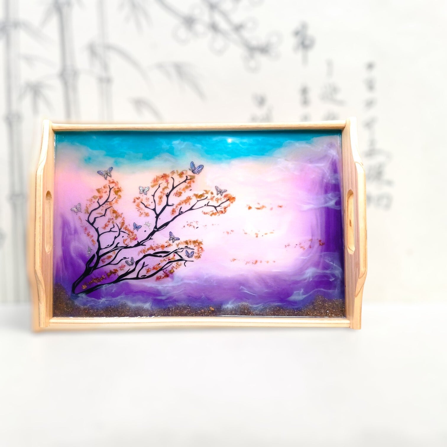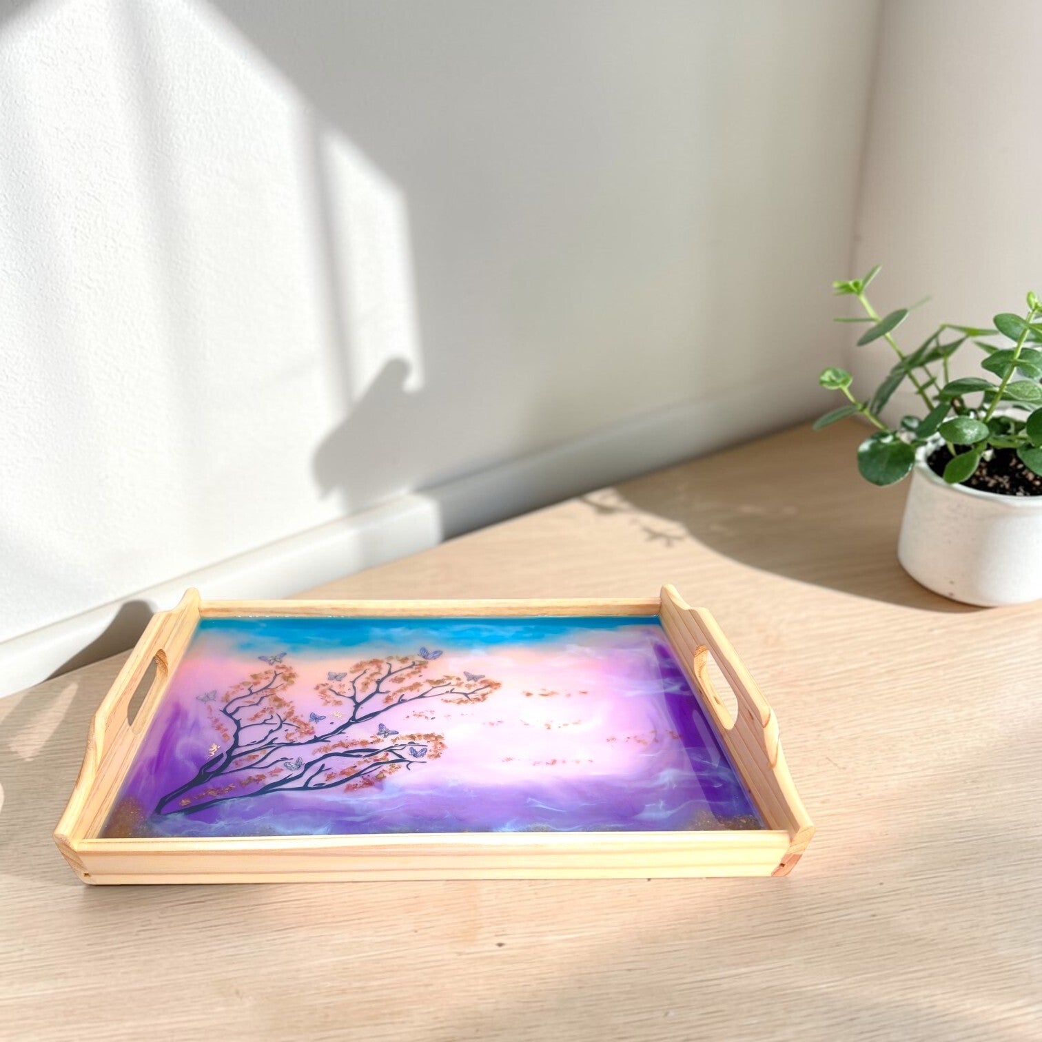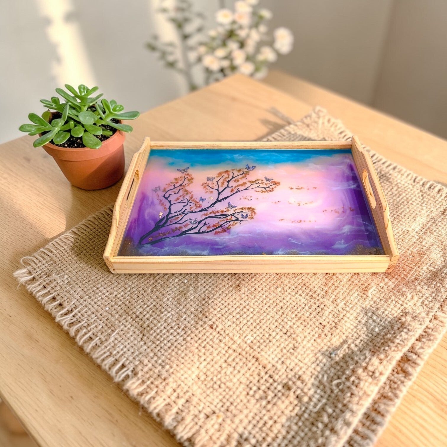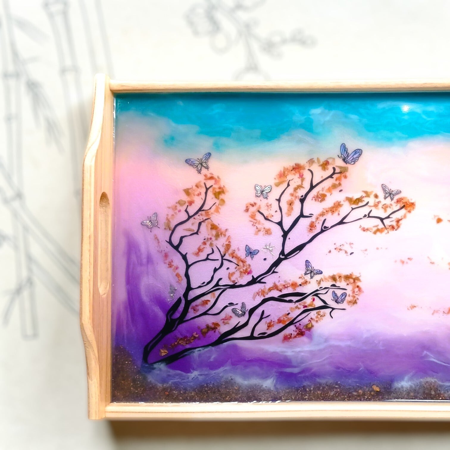 Chaque image révèle une facette du plateau rectangulaire féerique : les nuances délicates, les reflets de la résine et les détails du décor qui rendent chaque création unique.