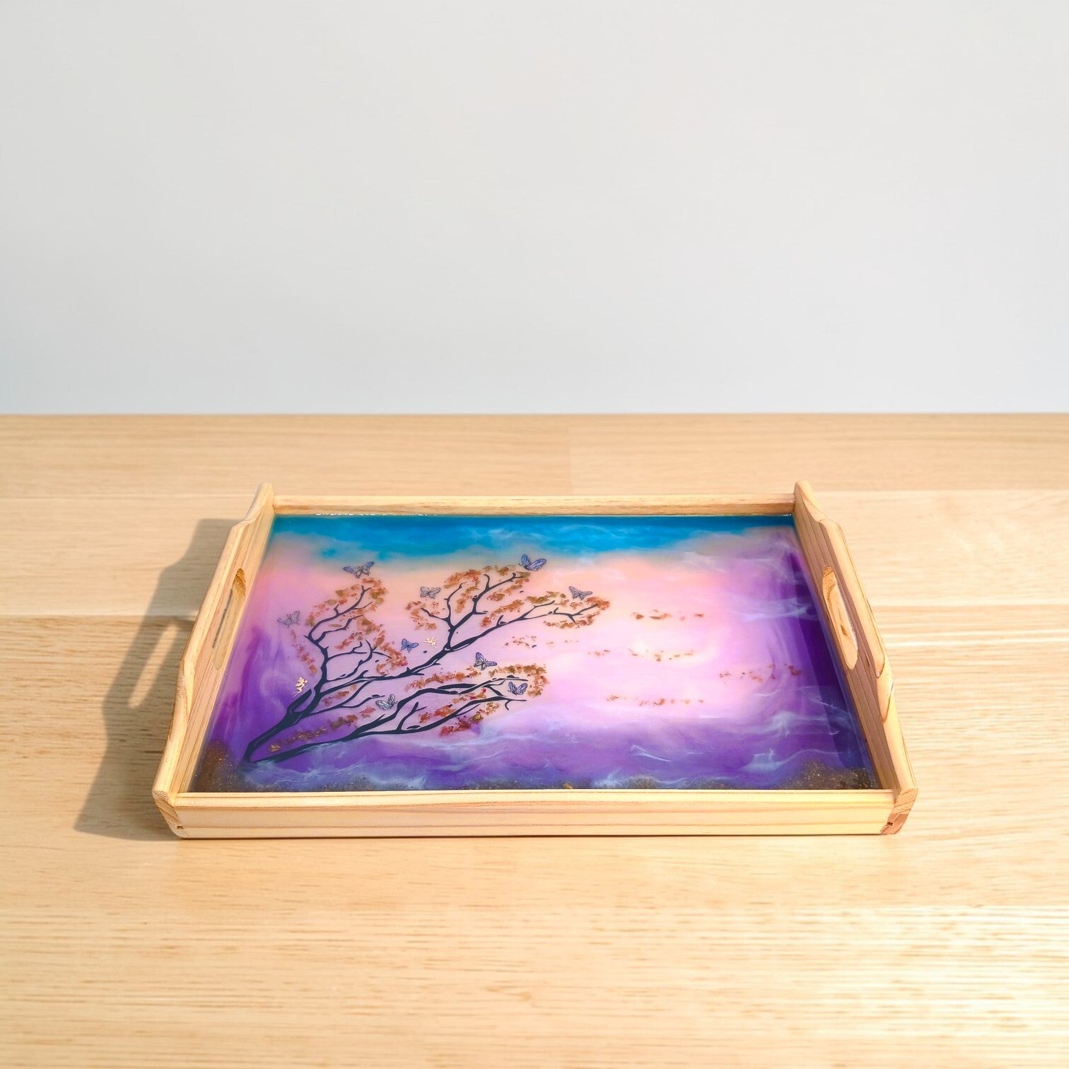 Les nuances de résine, les motifs intégrés et les jeux de transparence composent un décor délicat qui capte la lumière et révèle toute la richesse du travail artisanal. Chaque détail participe à l’équilibre de la pièce et donne au plateau une présence élégante et singulière.
