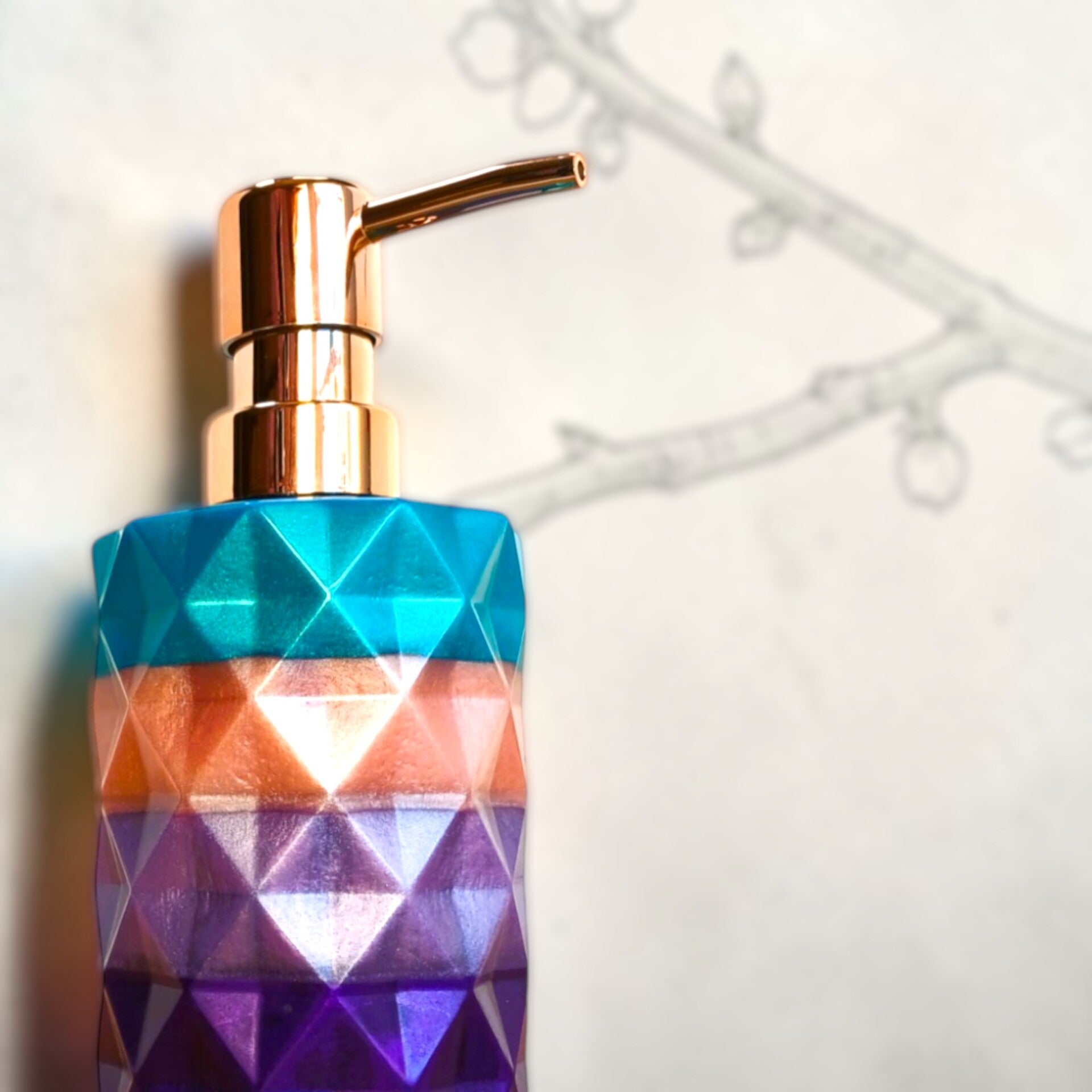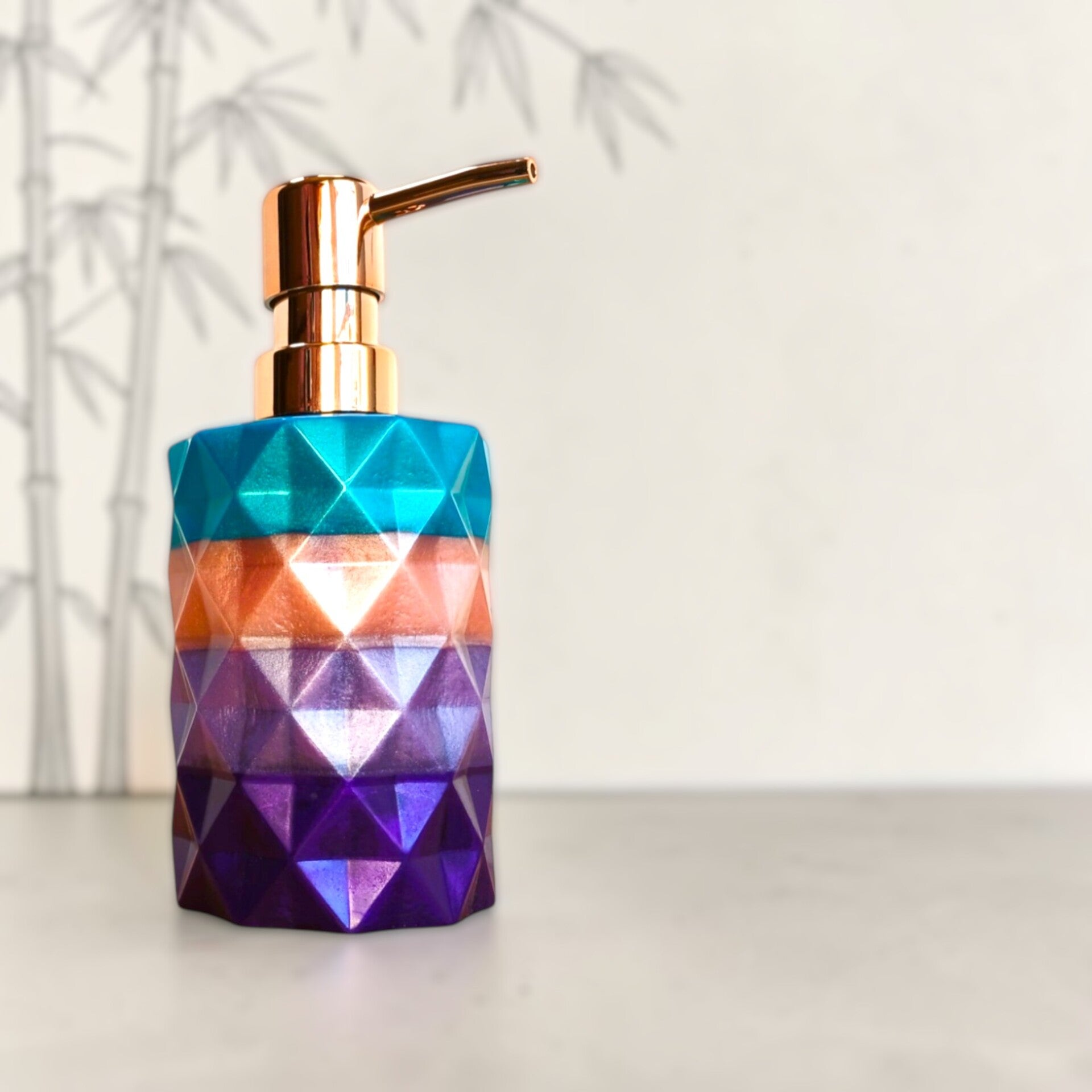 Ses nuances de turquoise, rose et violet se mêlent dans la résine pour créer un dégradé lumineux qui attire naturellement le regard.