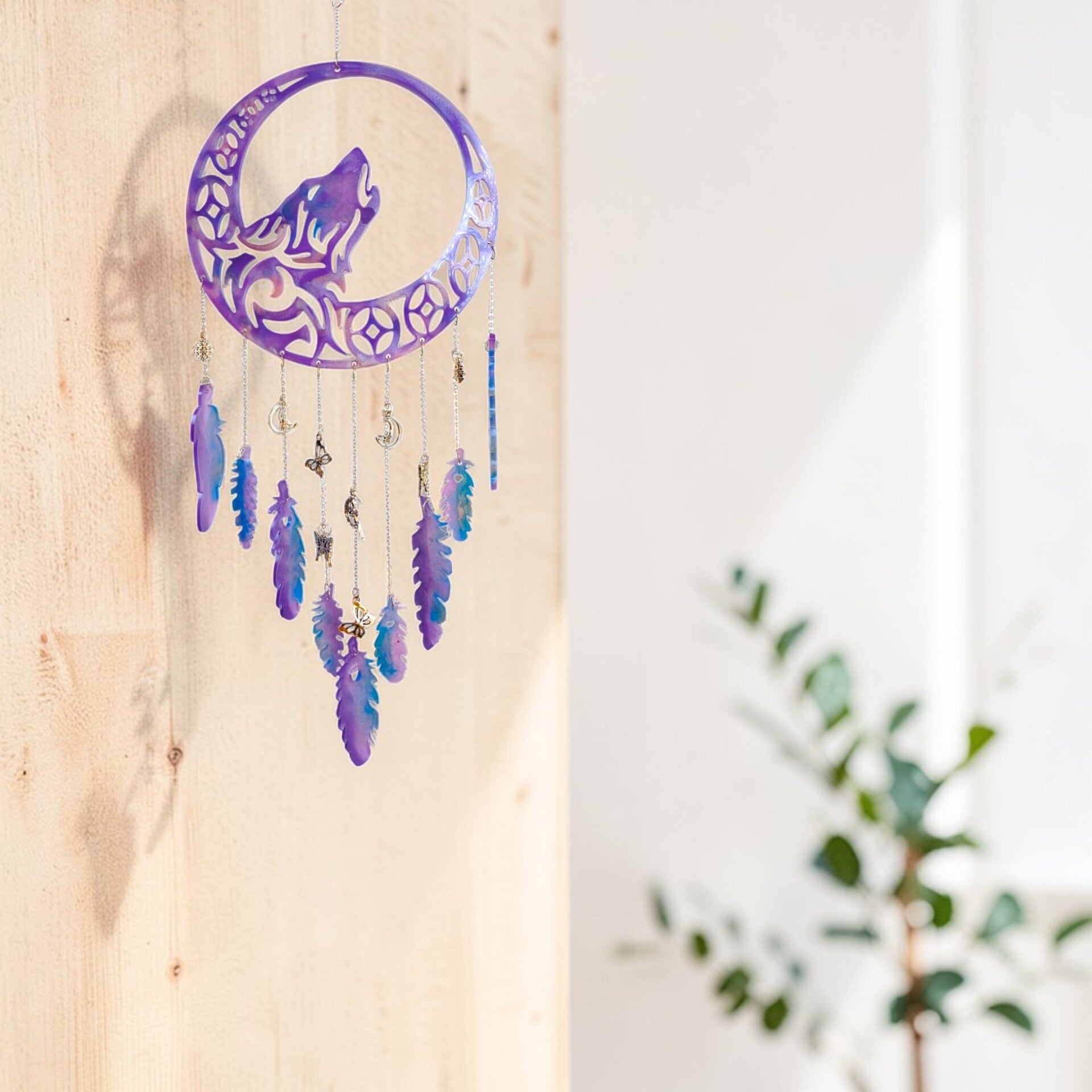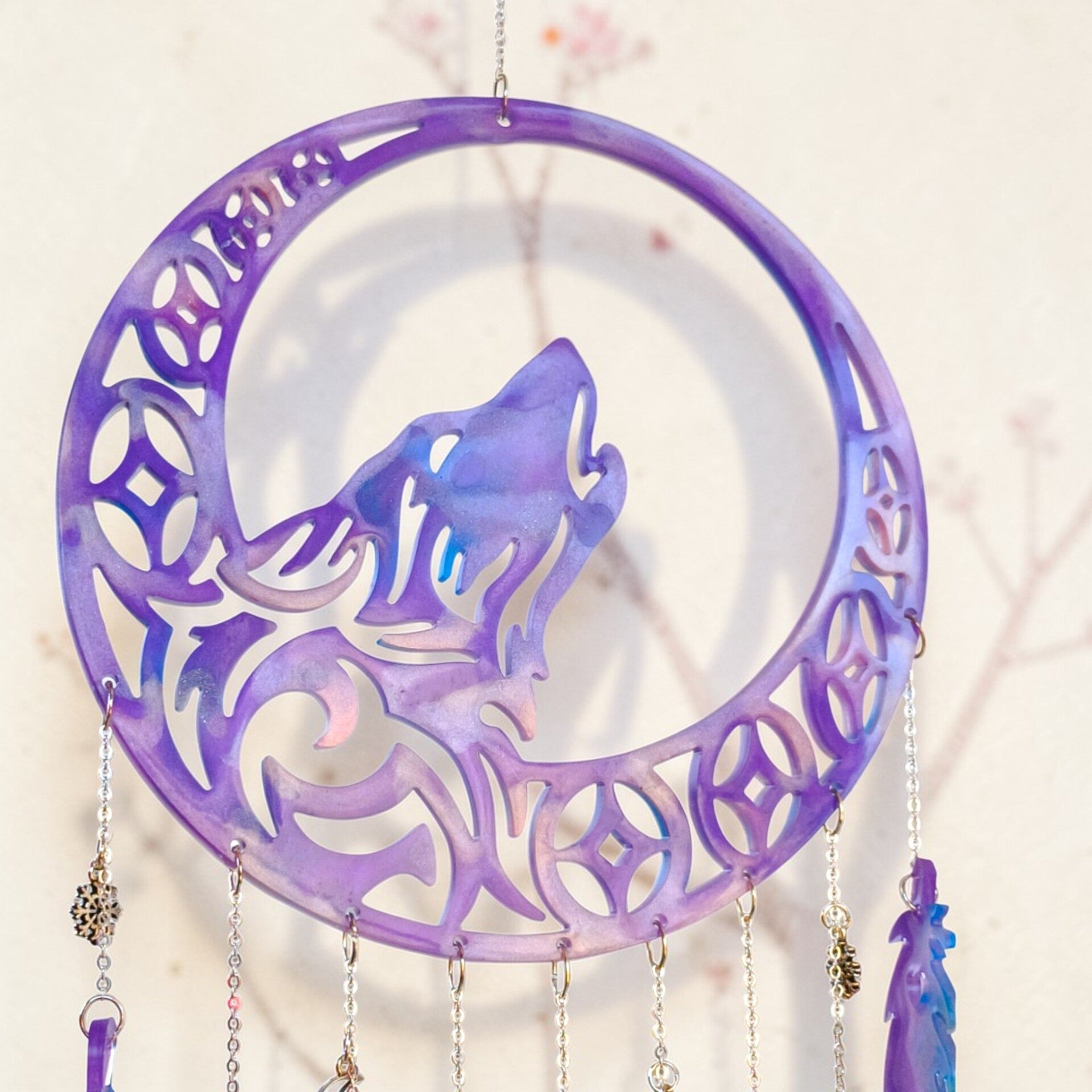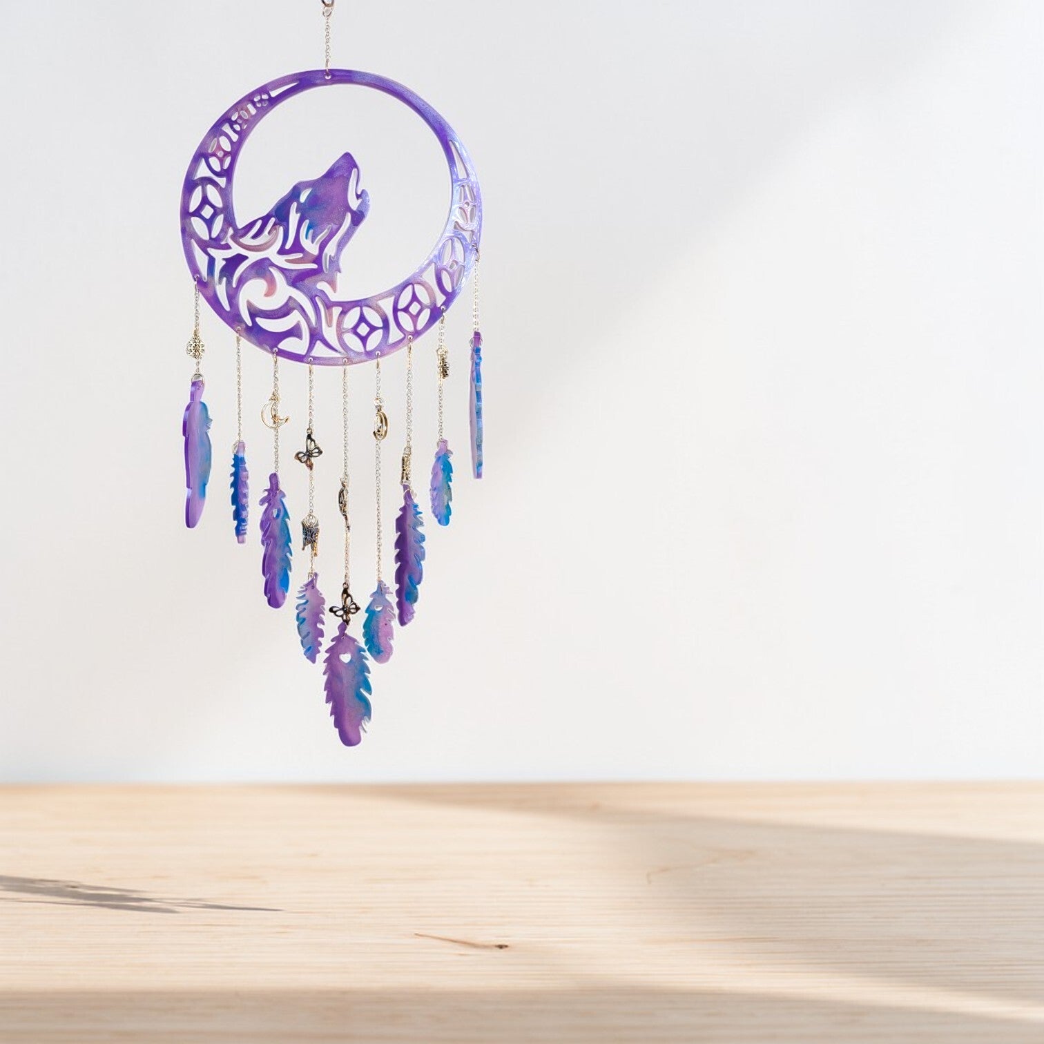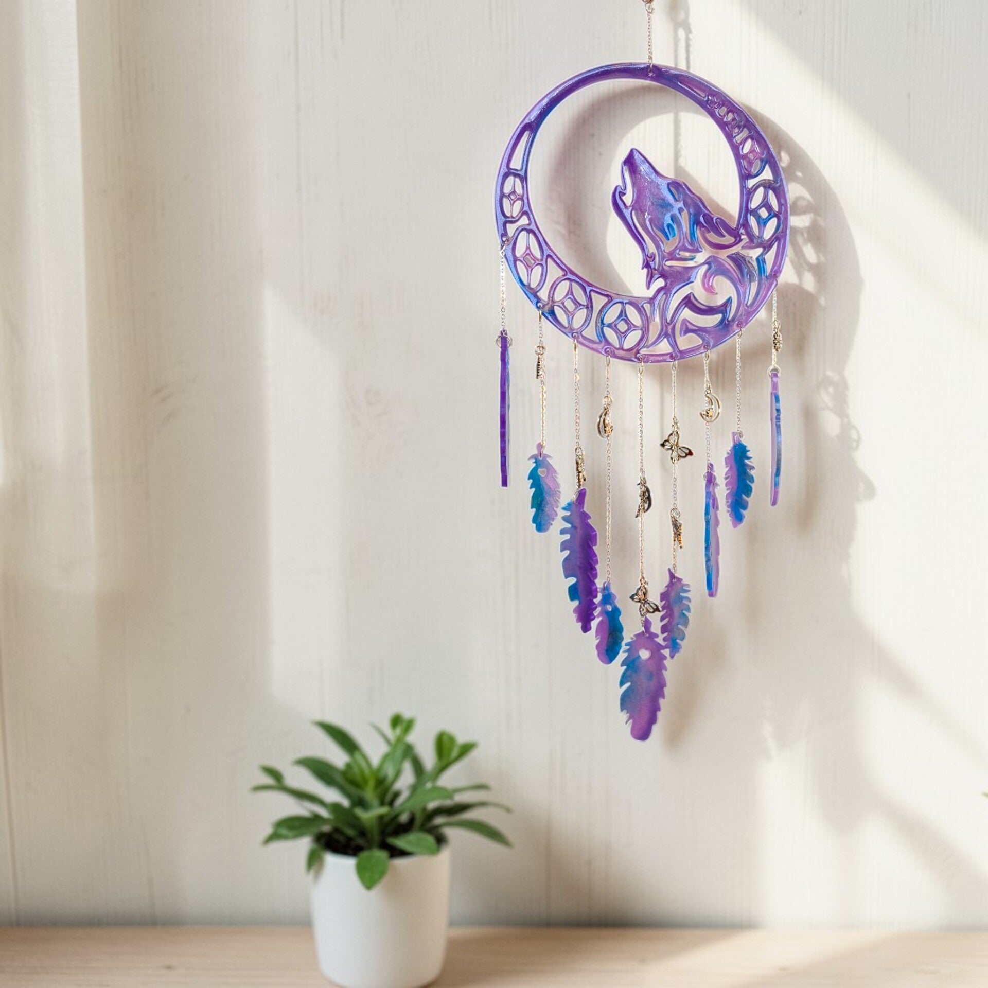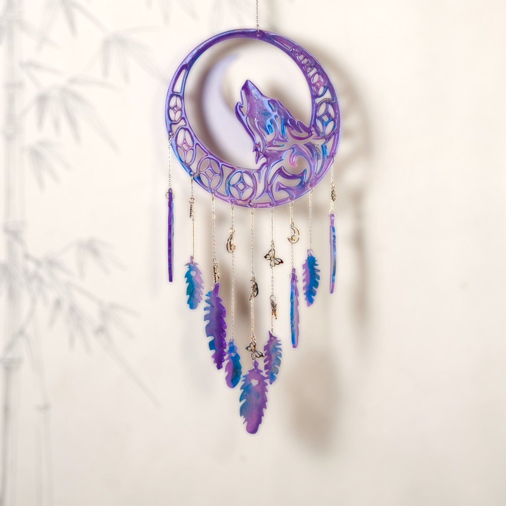 Chaque image révèle une facette de l’Attrape-rêve loup féerique : les nuances de couleur, les reflets de la résine et cette présence lumineuse qui attire naturellement le regard.