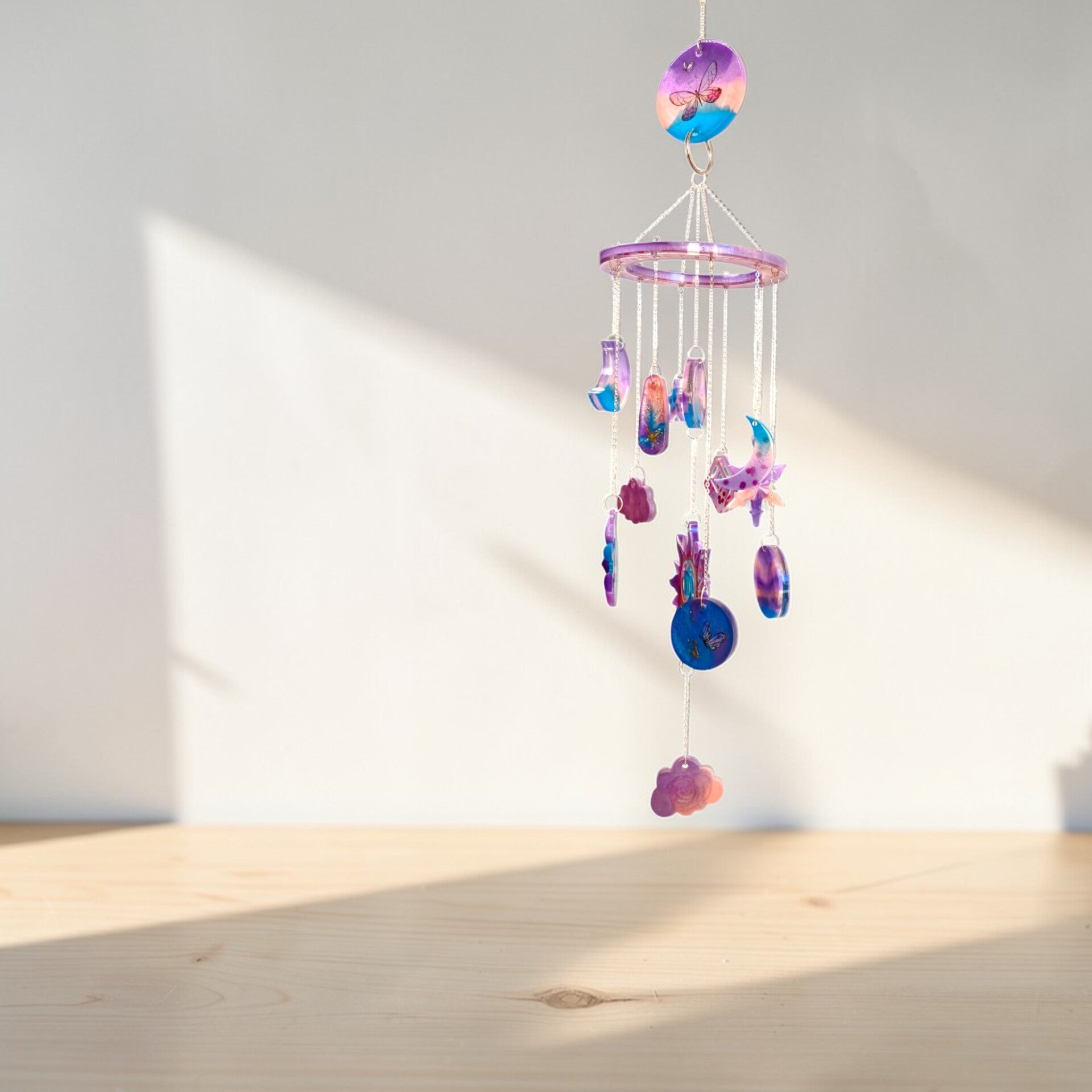 Ses éléments suspendus, leurs nuances subtiles et les reflets de la résine captent la lumière avec élégance, apportant une présence douce et apaisante à l’intérieur.