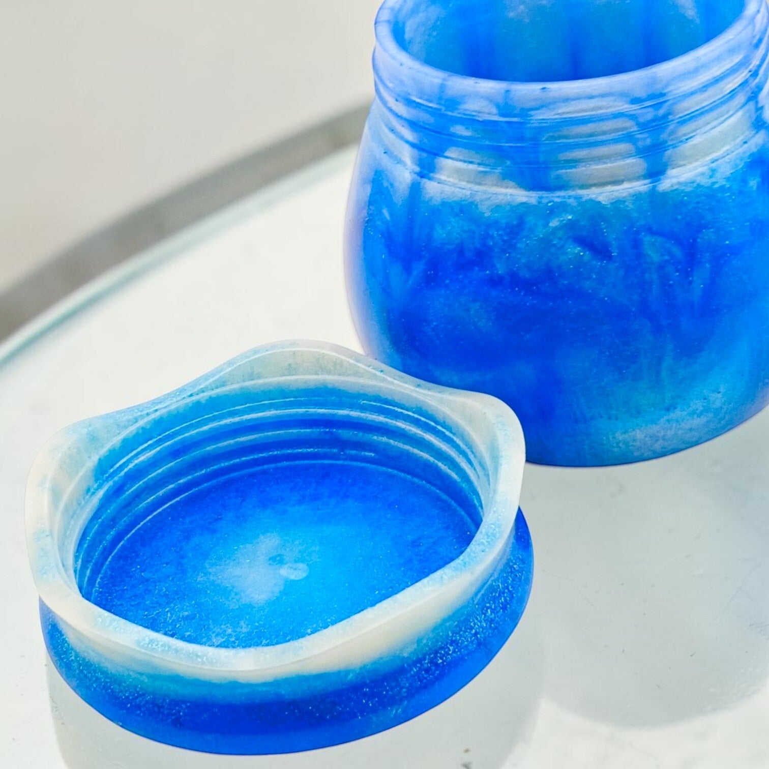 Chaque image révèle une facette de la boîte Murmures d’Hiver : les nuances de bleu, les effets givrés de la résine et cette lumière douce qui semble se déposer délicatement sur la surface.