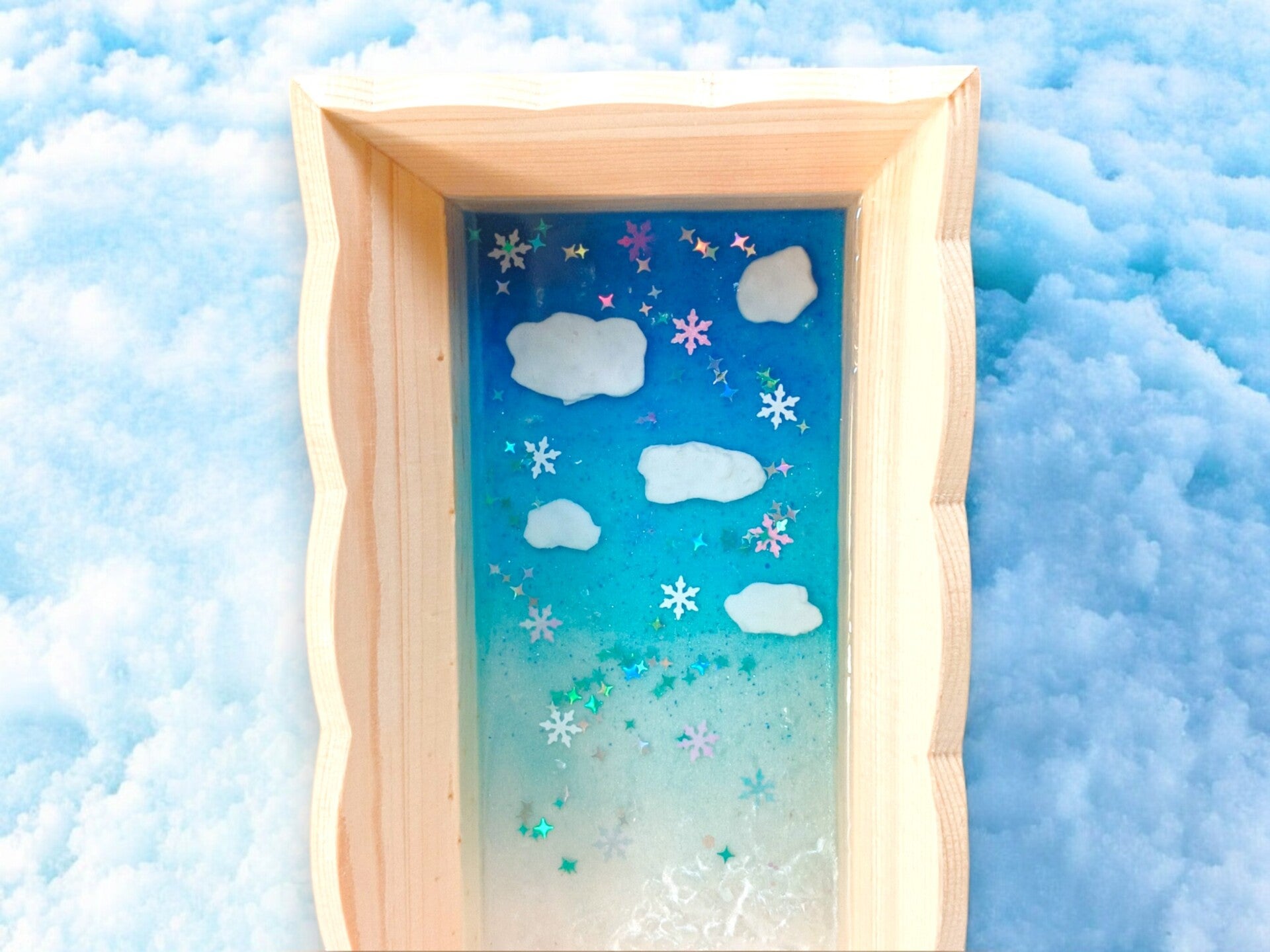 Matériaux : Résine époxy, pigments colorants, paillette, coton et support bois