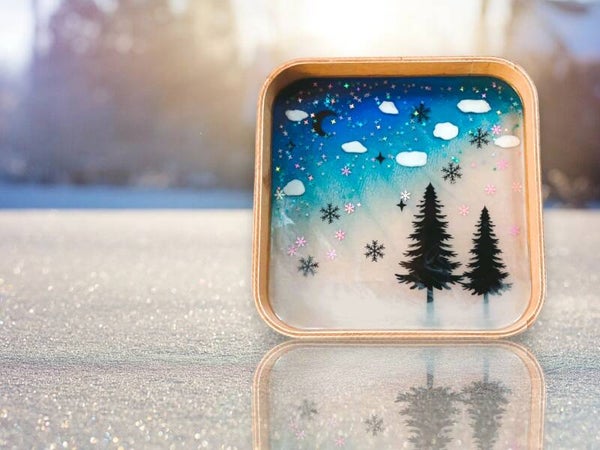 Matériaux : résine époxy, pigments, motif intégré, inclusions décoratives, support bois