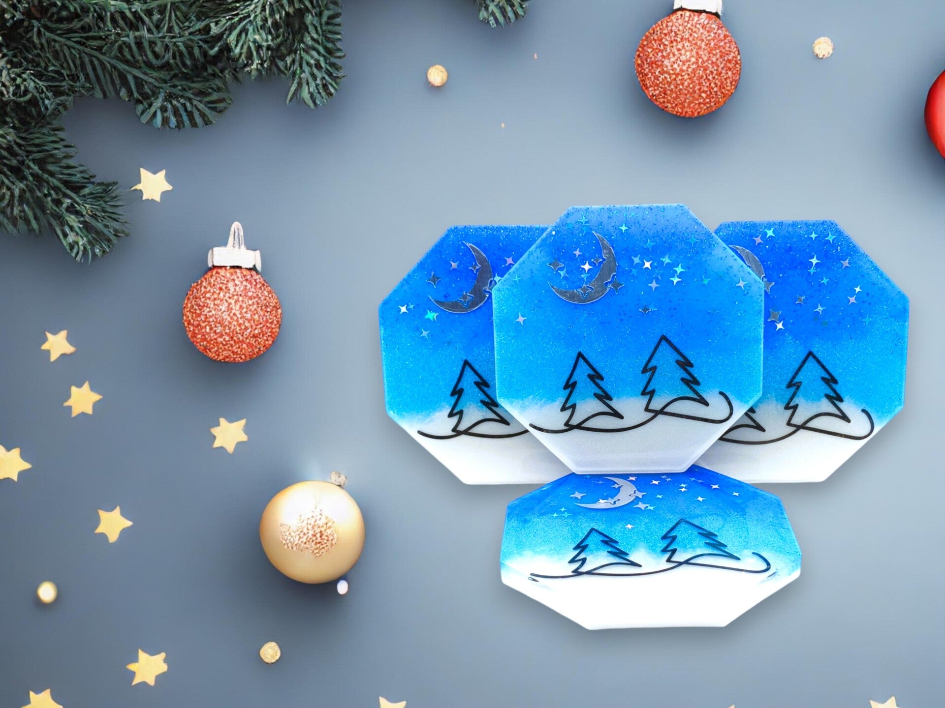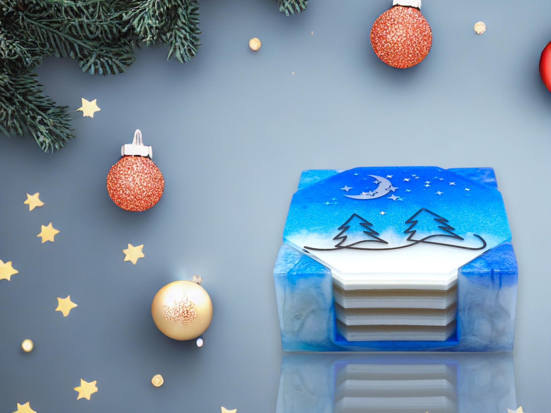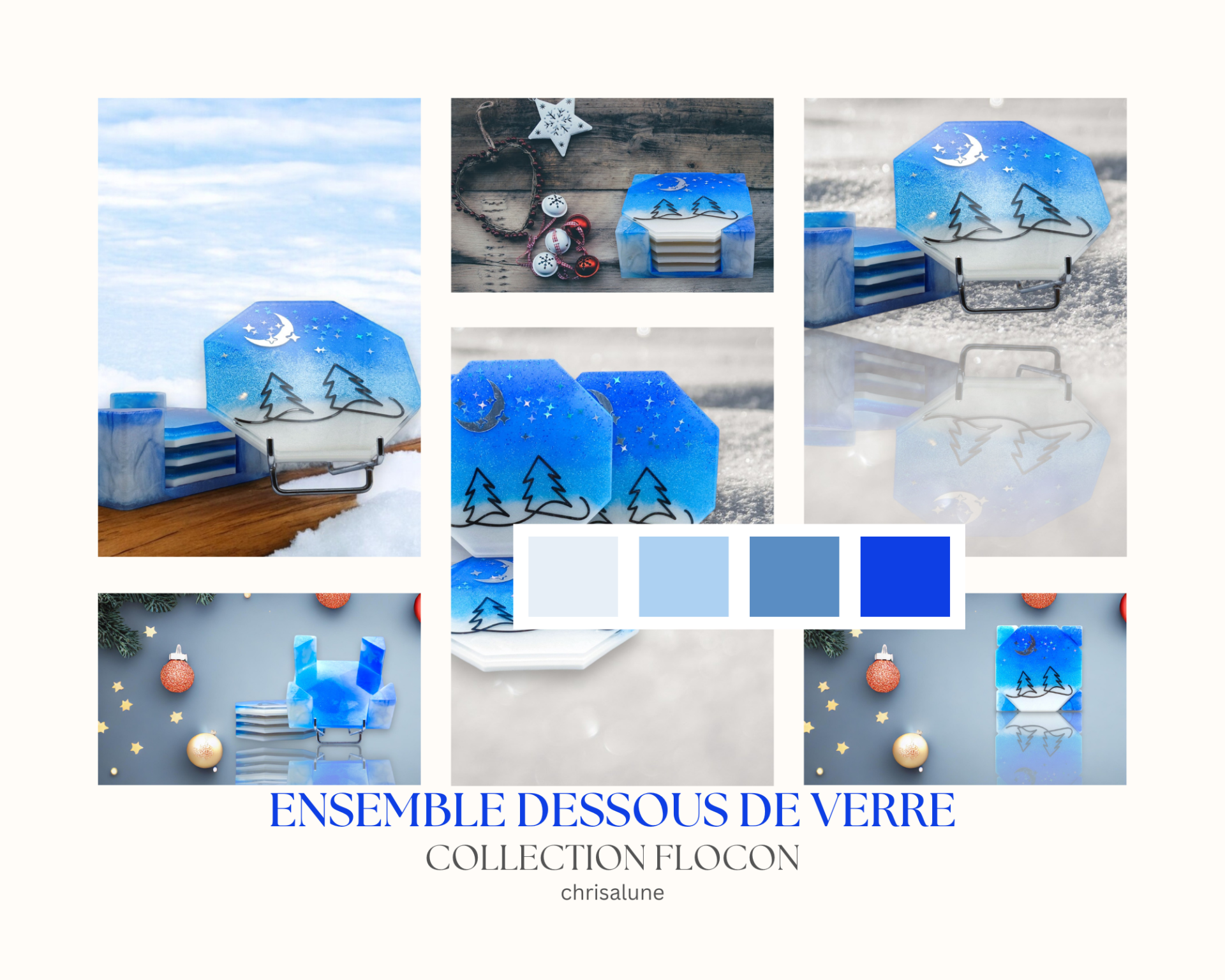 Plongez dans la magie hivernale de la Collection Flocon avec cet ensemble de sous-verres en résine époxy. Chaque pièce, réalisée à la main, capture la poésie des paysages enneigés à travers des nuances de bleu profond et de blanc givré, rehaussées d’éclats scintillants. De véritables petits bijoux décoratifs qui transforment chaque pause thé ou café en un instant de rêve.
