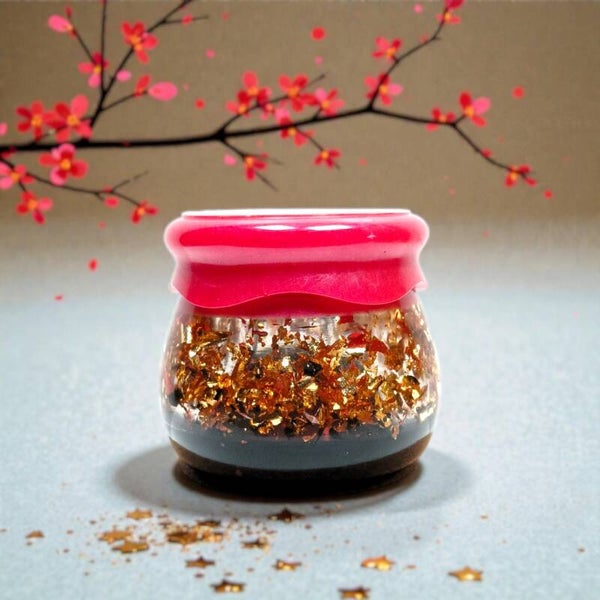 Issue de la collection Or Écarlate, cette création joue avec les nuances et les transparences, laissant apparaître des reflets dorés qui changent selon la lumière. Posée sur une console, une table basse ou une coiffeuse, elle attire le regard tout en restant douce dans sa présence.