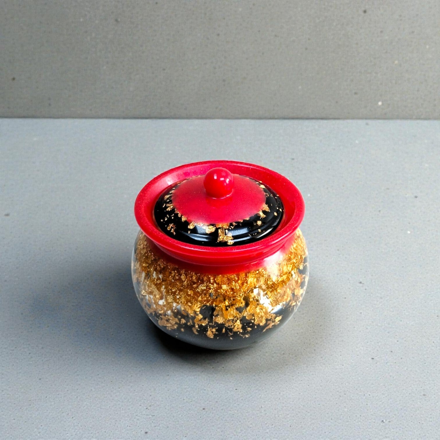 Issu de la collection Or Écarlate, ce pot combine élégance et subtilité. La résine révèle des reflets scintillants et des inclusions dorées qui évoluent selon la lumière, donnant à chaque pièce un caractère unique. Sa forme généreuse et délicatement modelée en fait un objet à la fois fonctionnel et poétique.
