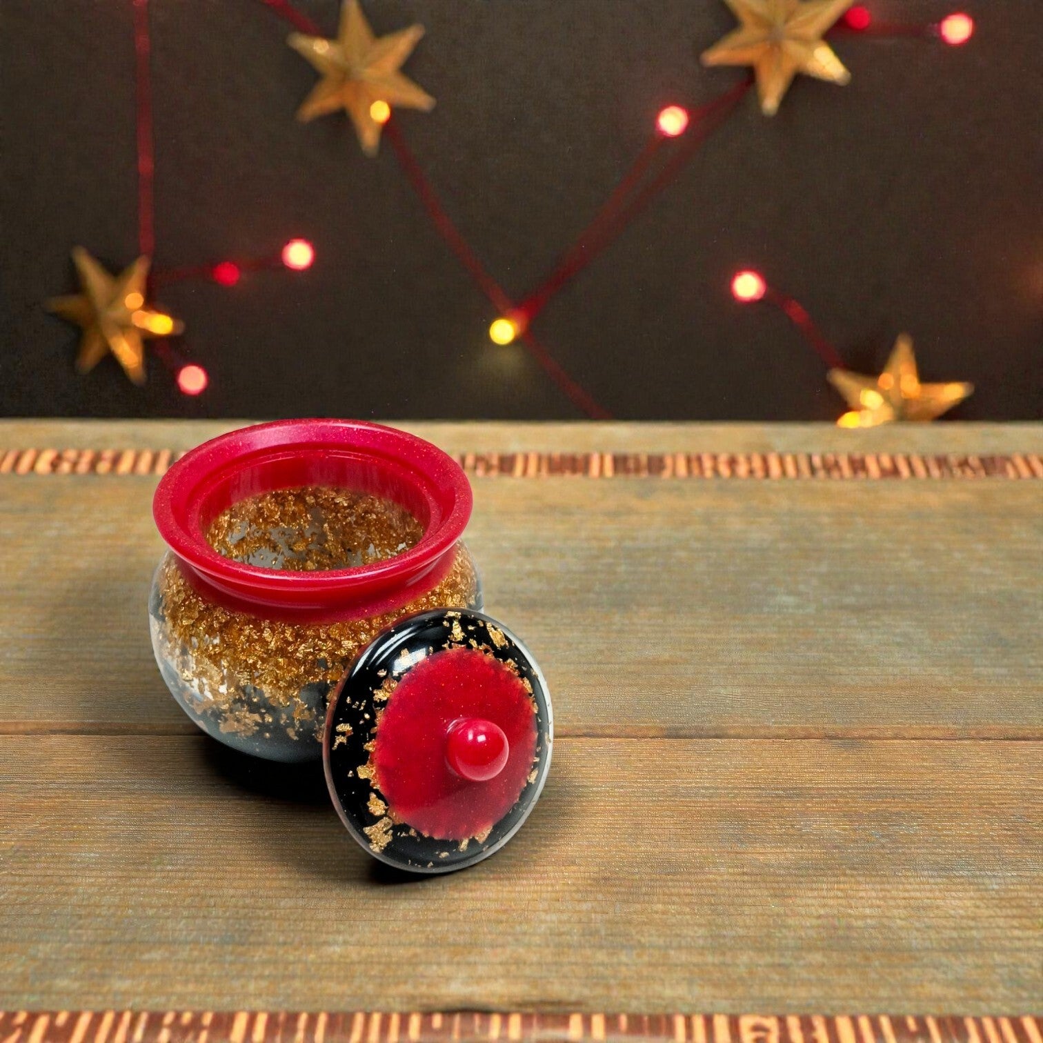 Chaque image révèle une facette du Pot Écrin Écarlate : la richesse des couleurs, la profondeur de la matière, les éclats dorés, la finesse des détails et ce moment de respiration où l’objet semble simplement poser sa présence.
