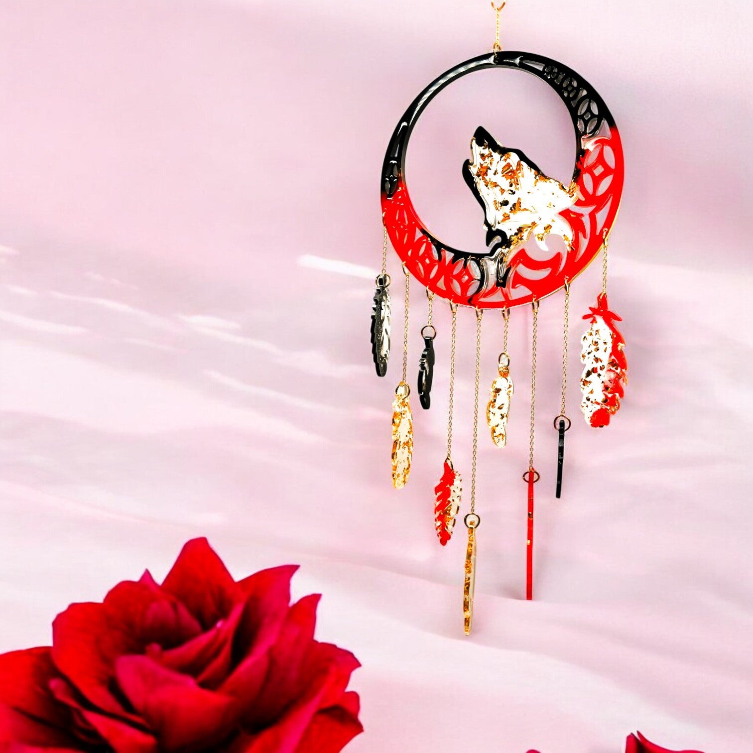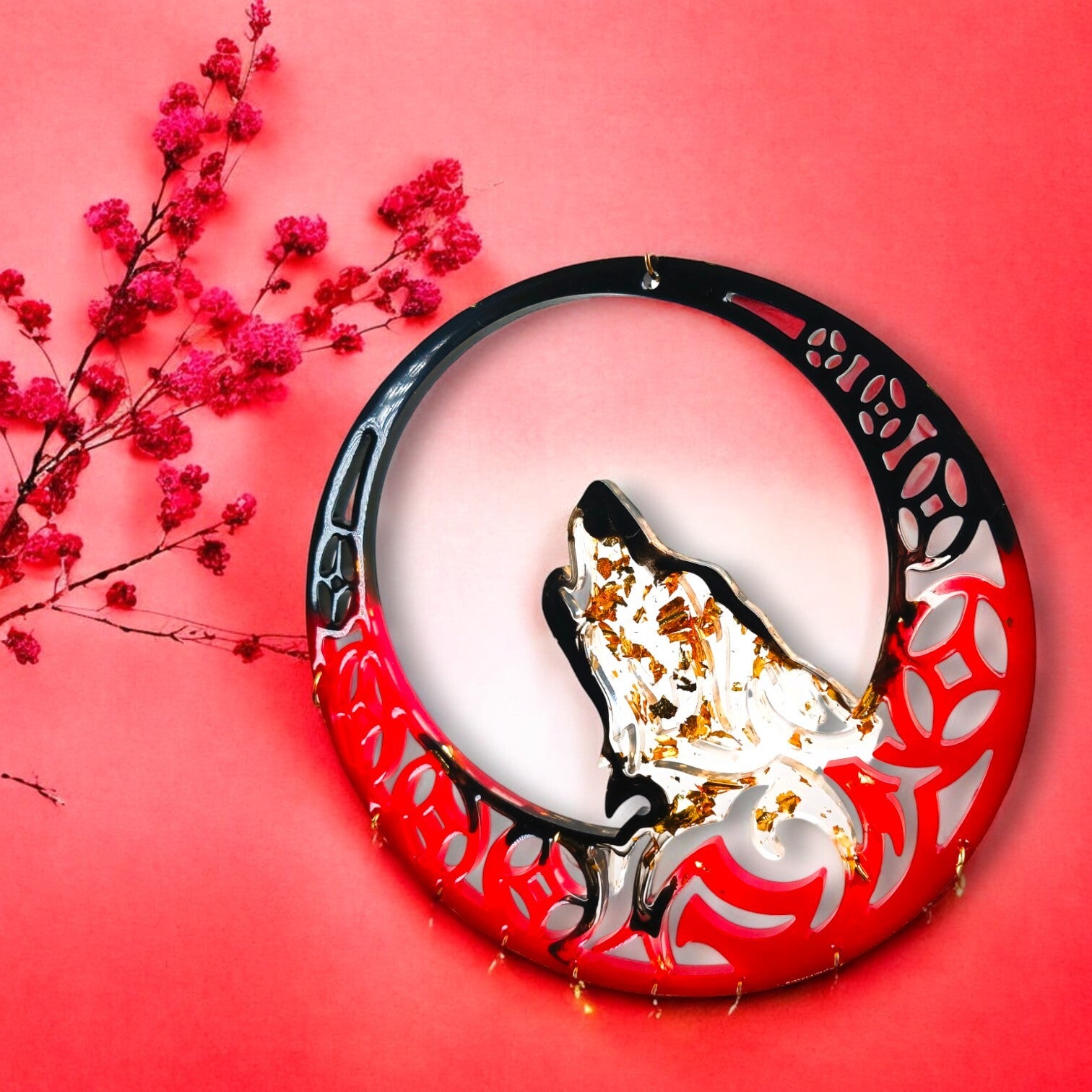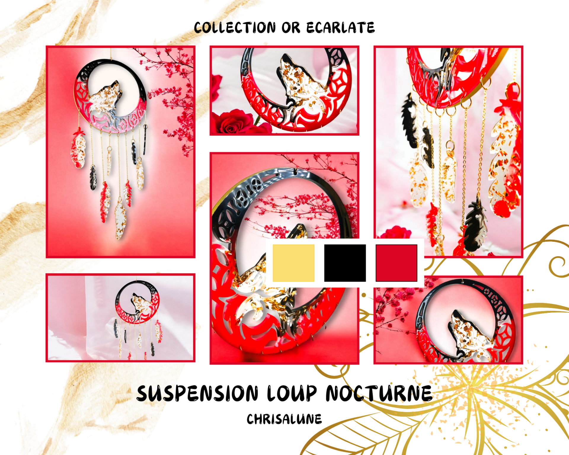 Inspirée par la puissance mystique du loup et la beauté des nuits étoilées, cette suspension décorative mêle élégamment résine noire, rouge écarlate et feuilles d’or.