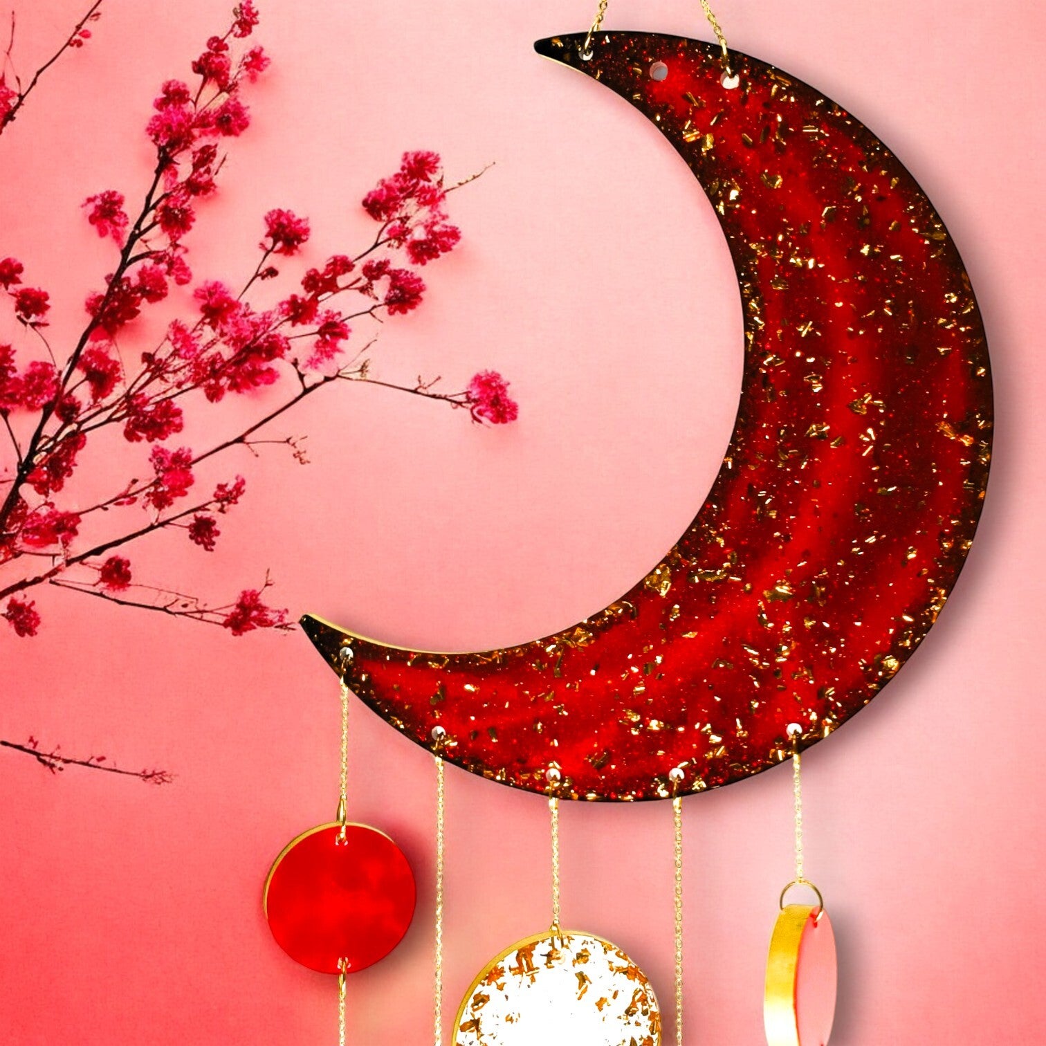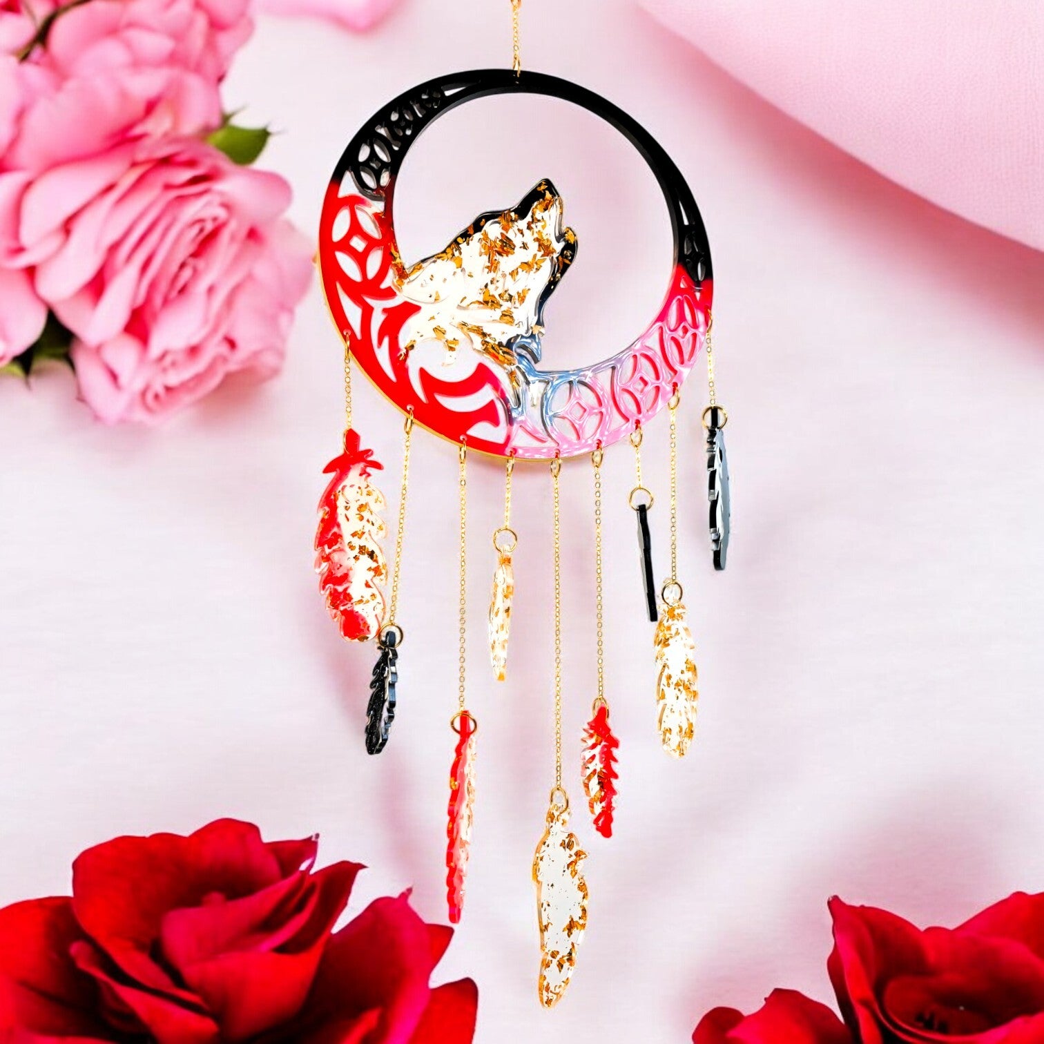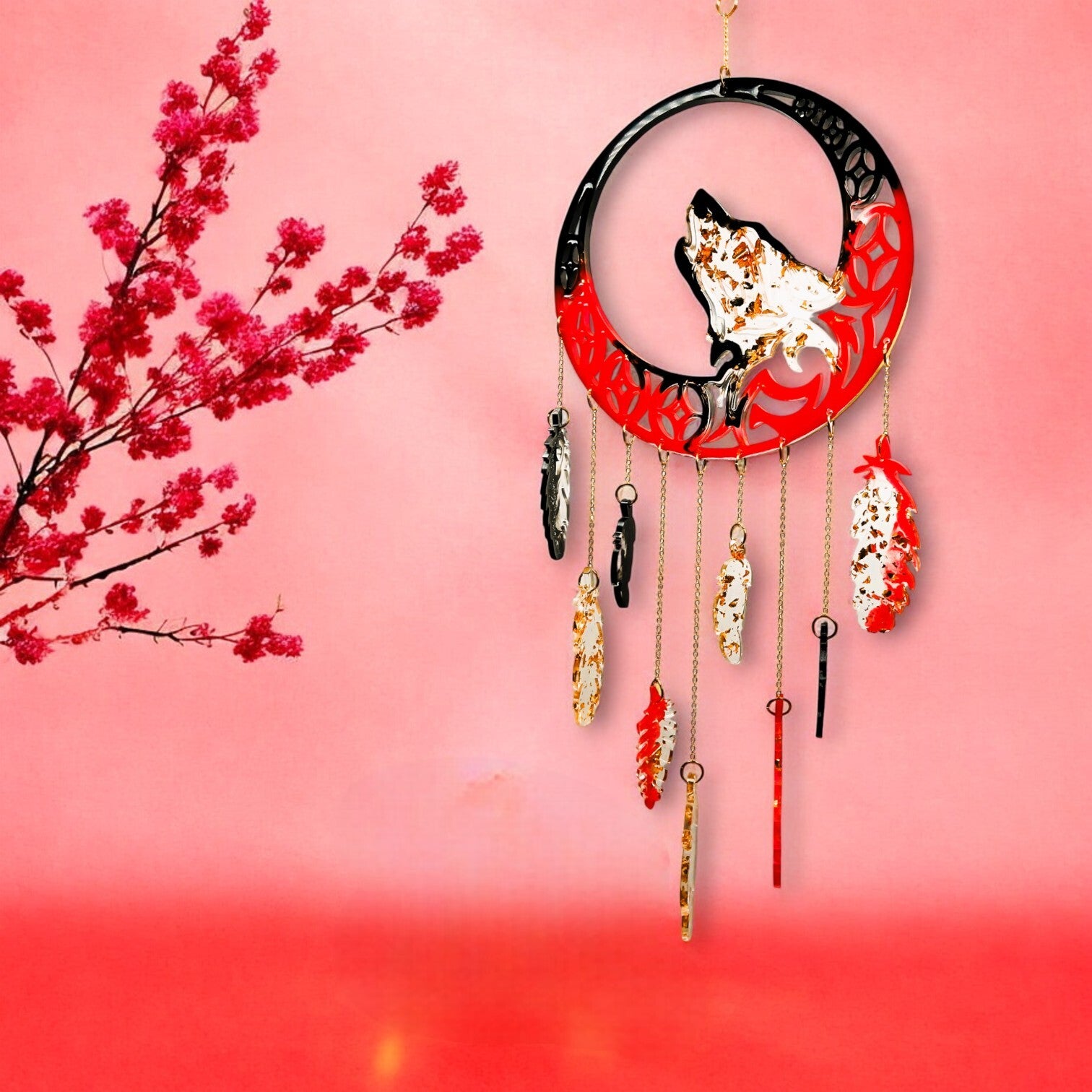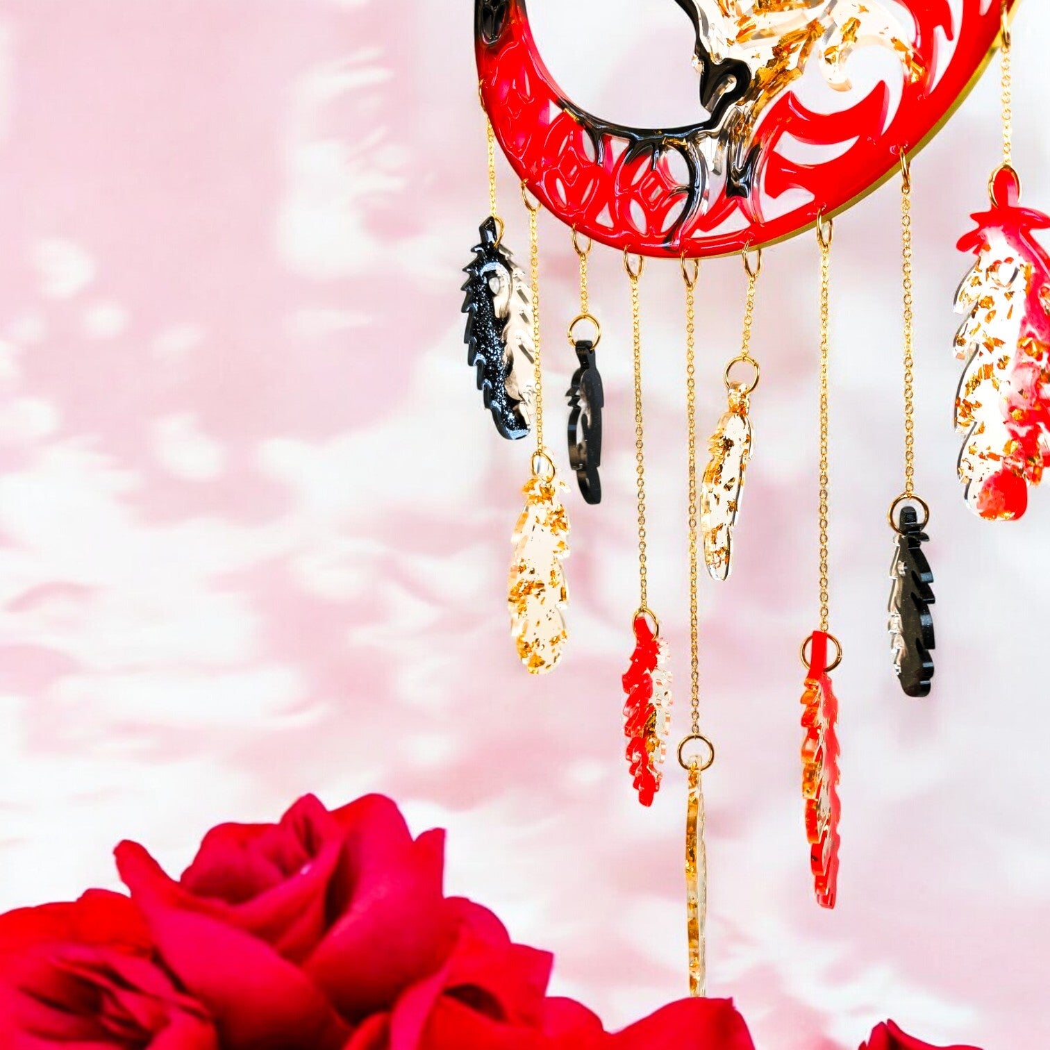 Inspirée par la puissance mystique du loup et la beauté des nuits étoilées, cette suspension décorative mêle élégamment résine noire, rouge écarlate et feuilles d’or.