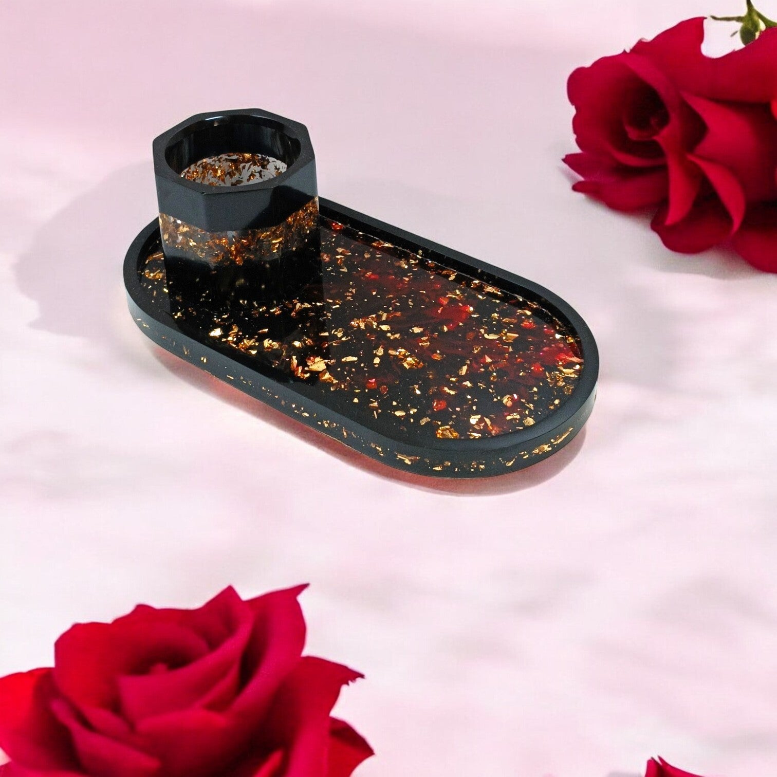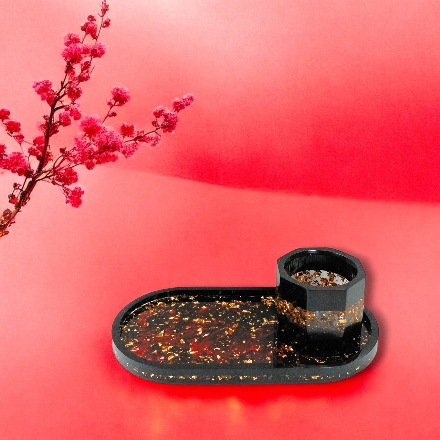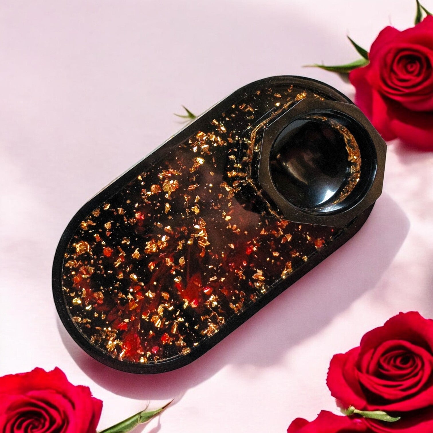 Un écrin pour vos bijoux, clés ou trésors du quotidien, sublimé par une composition luxueuse mêlant noir profond, éclats d’or et éclats rouge rubis. Chaque pièce est soigneusement coulée à la main, ce qui rend chaque exemplaire absolument unique.