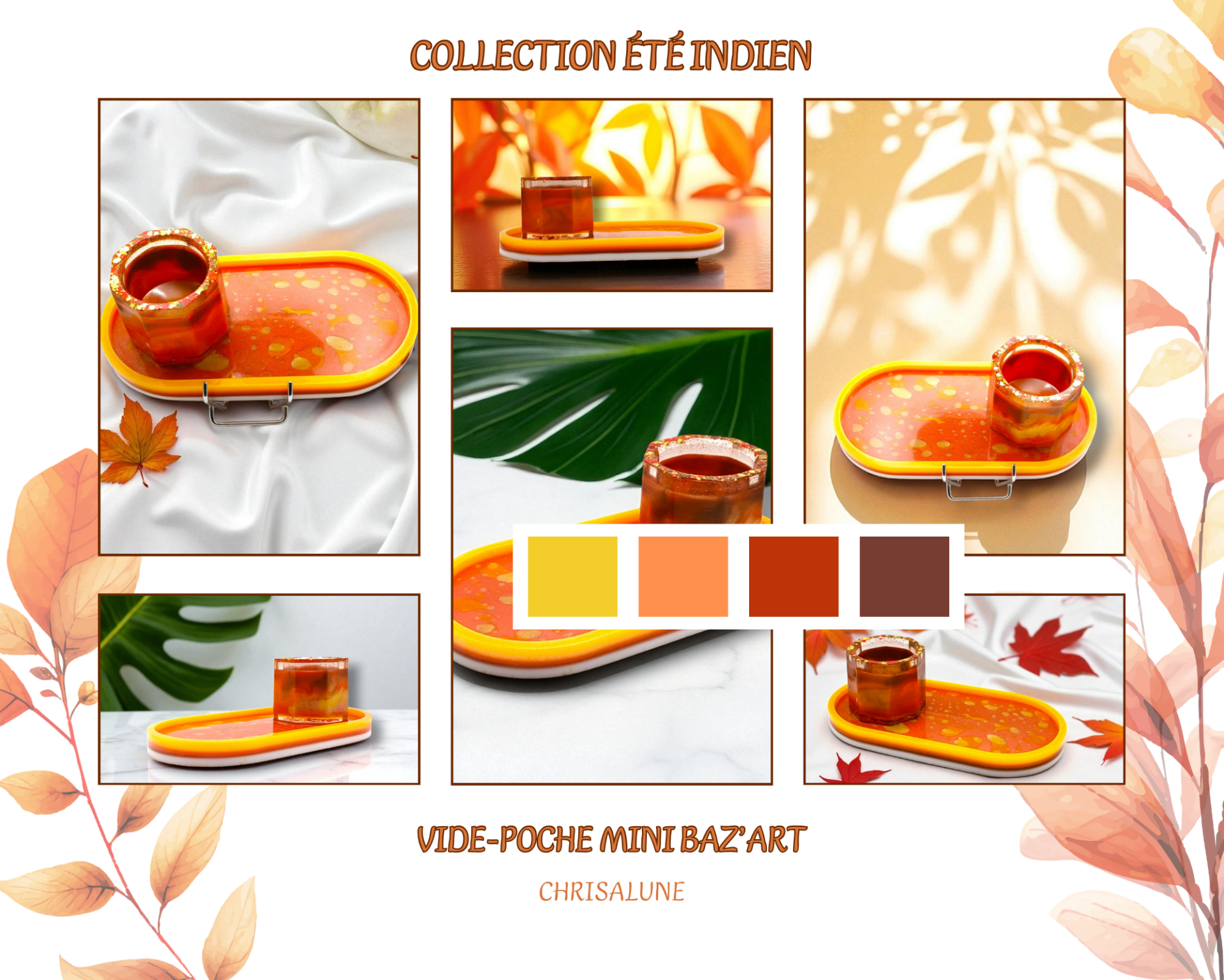 Plongez dans l’univers envoûtant de la collection Été Indien, où les nuances orangées et cuivrées s’entrelacent aux bruns profonds et aux éclats dorés, donnant naissance à un vide-poche aussi pratique qu’élégant, délicatement lumineux.